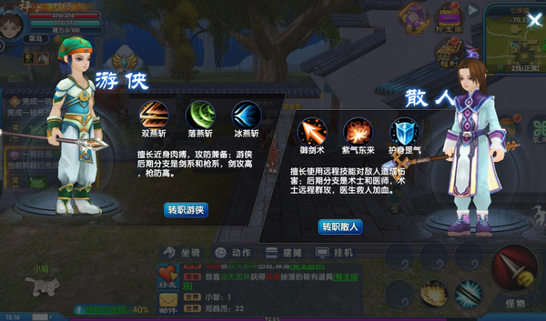 三,四大职业,职业划算很细腻 四大职业分别是剑客,枪豪,术士,医师。一转是选择专职游侠或者散人。剑客和枪豪属于游侠二转职业,术士和医师属于散人二转职业!
